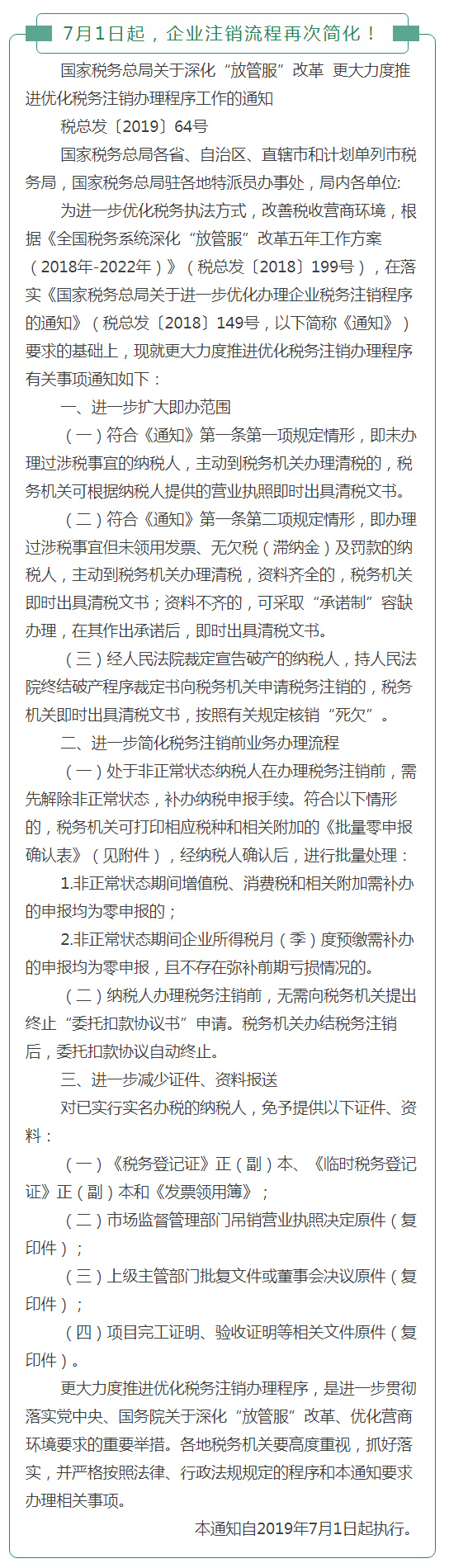 國(guó)家稅務(wù)總局日前印發(fā)《關(guān)于深化“放管服”改革 更大力度推進(jìn)優(yōu)化稅務(wù)注銷(xiāo)辦理程序工作的通知》,《通知》指出,進(jìn)一步擴(kuò)大即辦范圍;進(jìn)一步簡(jiǎn)化稅務(wù)注銷(xiāo)前業(yè)務(wù)辦理流程;進(jìn)一步減少證件、資料報(bào)送。對(duì)已實(shí)行實(shí)名辦稅的納稅人,免予提供以下證件、資料:《稅務(wù)登記證》正(副)本、《臨時(shí)稅務(wù)登記證》正(副)本和《發(fā)票領(lǐng)用簿》;市場(chǎng)監(jiān)督管理部門(mén)吊銷(xiāo)營(yíng)業(yè)執(zhí)照決定原件(復(fù)印件);上級(jí)主管部門(mén)批復(fù)文件或董事會(huì)決議原件(復(fù)印件);項(xiàng)目完工證明、驗(yàn)收證明等相關(guān)文件原件(復(fù)印件)。